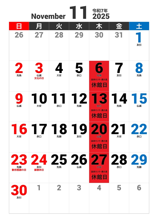 【2025年11月01日】温泉センター鷹の湯 2025年11月の休館日
