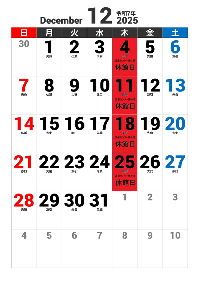 【2025年11月28日】温泉センター鷹の湯 2025年12月の休館日