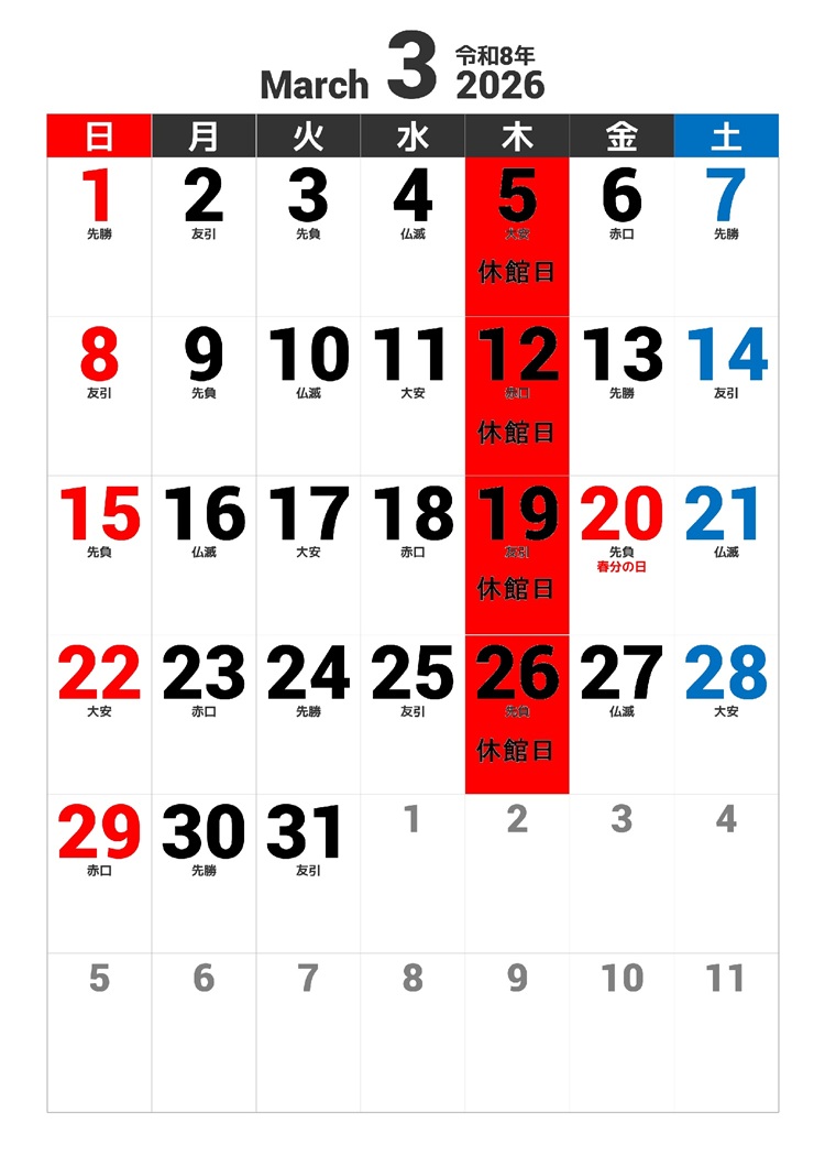 【2026年03月01日】温泉センター鷹の湯 2026年3月の休館日